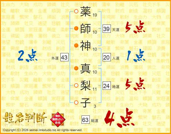 薬(19画)師(10画)神(10画) 真(10画)梨(11画)子(3画)