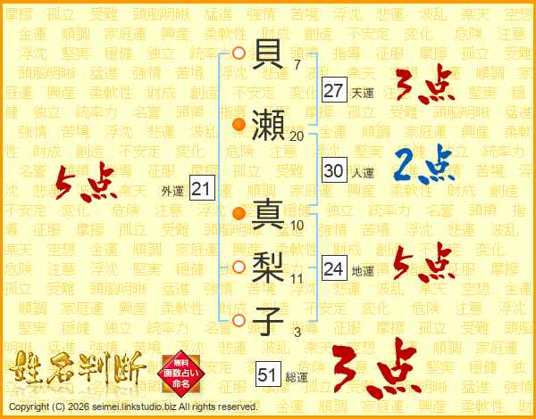 貝瀬真梨子さんの総運は51画の3点!