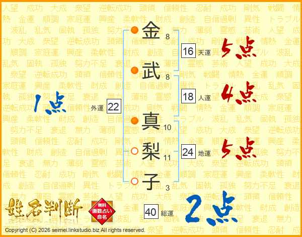 金(8画)武(8画) 真(10画)梨(11画)子(3画)