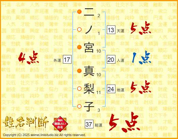 二(2画)ノ(1画)宮(10画) 真(10画)梨(11画)子(3画)