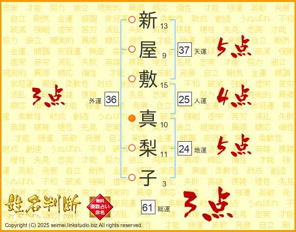 新(13画)屋(9画)敷(15画) 真(10画)梨(11画)子(3画)