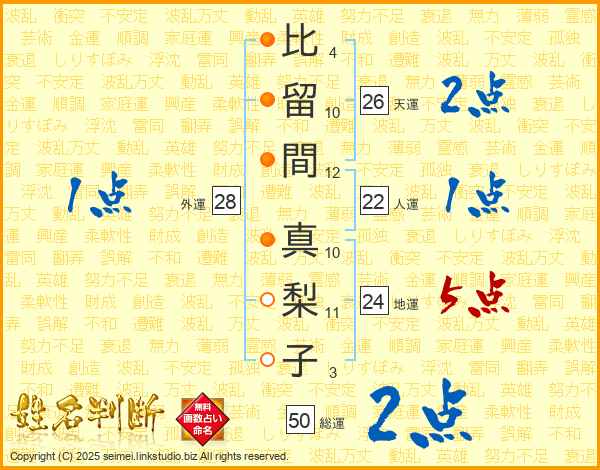 比(4画)留(10画)間(12画) 真(10画)梨(11画)子(3画)