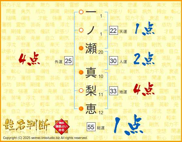 一ノ瀬真梨恵さんの地運は33画の4点!