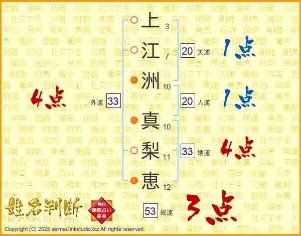 上(3画)江(7画)洲(10画) 真(10画)梨(11画)恵(12画)
