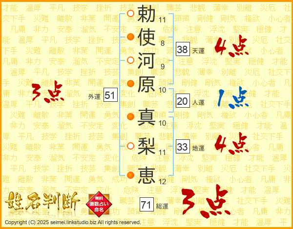 勅(11画)使(8画)河(9画)原(10画) 真(10画)梨(11画)恵(12画)