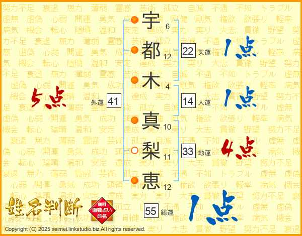 宇(6画)都(12画)木(4画) 真(10画)梨(11画)恵(12画)