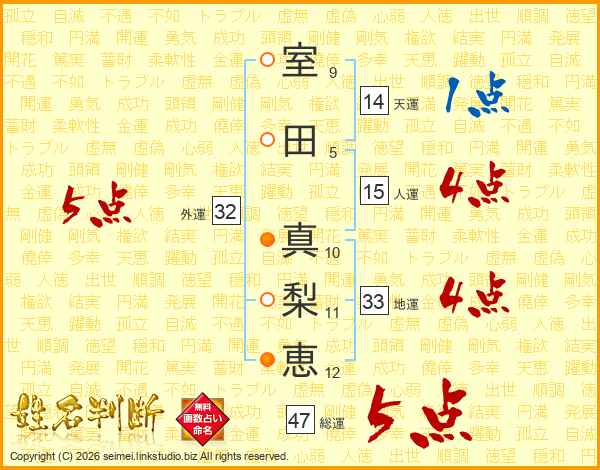 室(9画)田(5画) 真(10画)梨(11画)恵(12画)