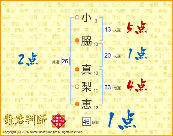 小(3画)脇(10画) 真(10画)梨(11画)恵(12画)