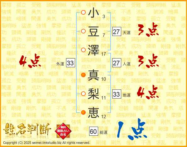 小(3画)豆(7画)澤(17画) 真(10画)梨(11画)恵(12画)