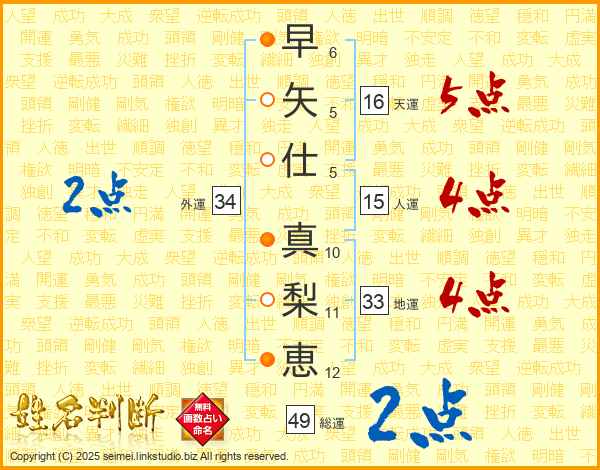 早(6画)矢(5画)仕(5画) 真(10画)梨(11画)恵(12画)
