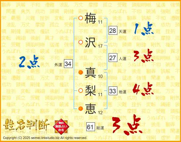 梅(11画)沢(17画) 真(10画)梨(11画)恵(12画)