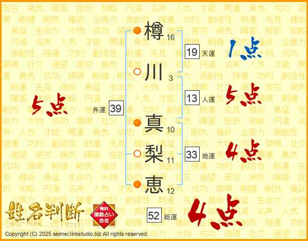樽(16画)川(3画) 真(10画)梨(11画)恵(12画)