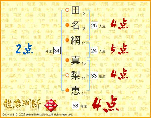田(5画)名(6画)網(14画) 真(10画)梨(11画)恵(12画)