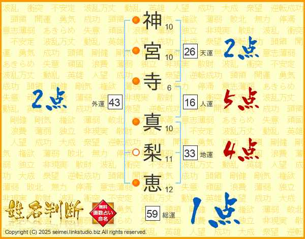 神(10画)宮(10画)寺(6画) 真(10画)梨(11画)恵(12画)