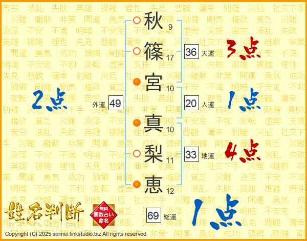 秋(9画)篠(17画)宮(10画) 真(10画)梨(11画)恵(12画)