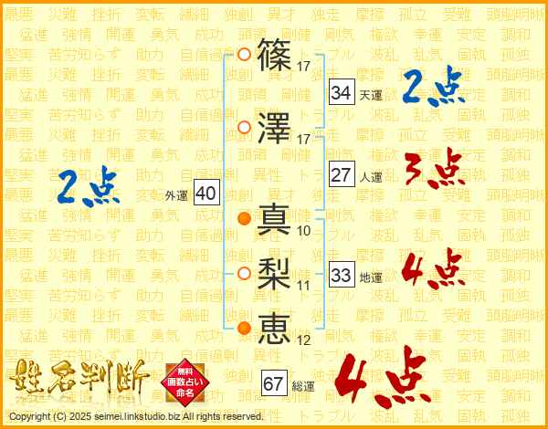 篠(17画)澤(17画) 真(10画)梨(11画)恵(12画)
