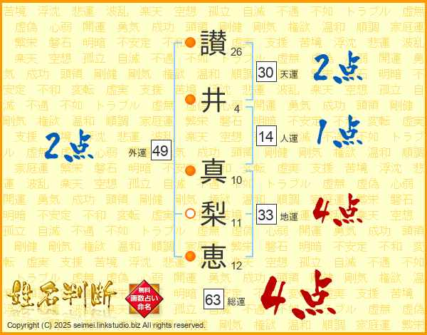 讃(26画)井(4画) 真(10画)梨(11画)恵(12画)