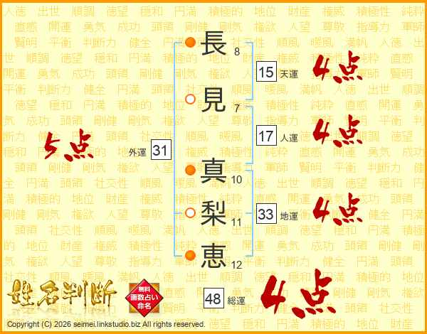 長(8画)見(7画) 真(10画)梨(11画)恵(12画)