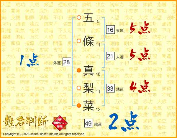五條真梨菜さんの総運は49画の2点!