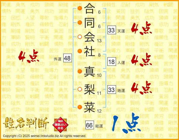 生活面を象徴する運勢です。外部から受ける影響力を表し、結婚運、家庭運や職場、環境への順応性を表します。総運から人運を引いた画数。姓や名が1文字の場合を除く。