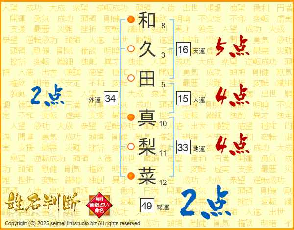 和(8画)久(3画)田(5画) 真(10画)梨(11画)菜(12画)