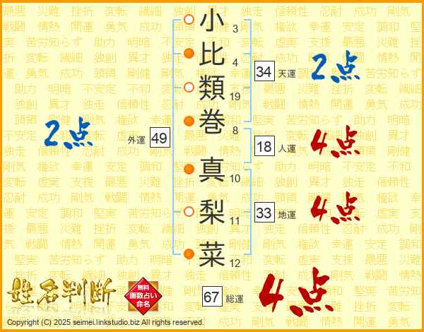小(3画)比(4画)類(19画)巻(8画) 真(10画)梨(11画)菜(12画)
