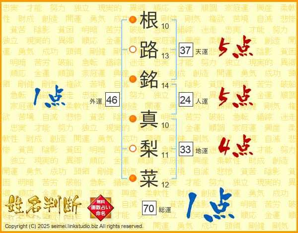 根(10画)路(13画)銘(14画) 真(10画)梨(11画)菜(12画)