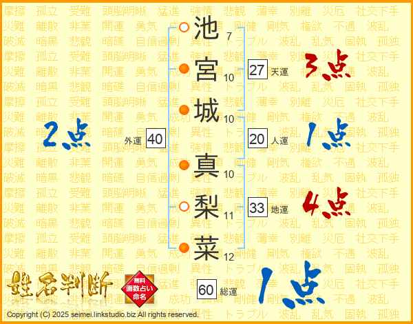 池(7画)宮(10画)城(10画) 真(10画)梨(11画)菜(12画)