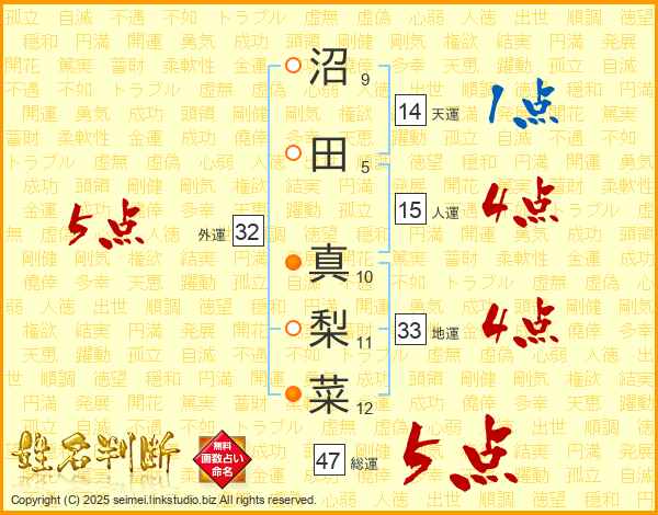 沼(9画)田(5画) 真(10画)梨(11画)菜(12画)