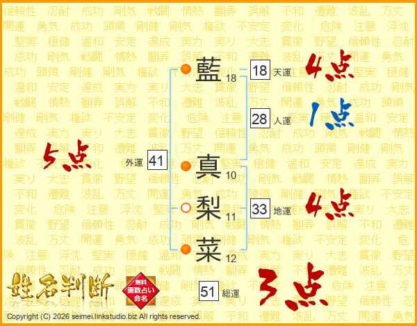 藍(18画) 真(10画)梨(11画)菜(12画)