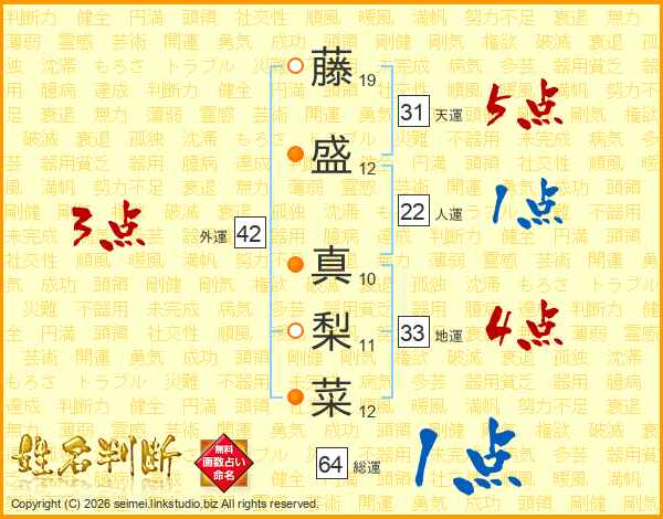 藤盛真梨菜さんの天運は31画の5点!