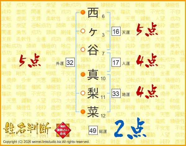西ヶ谷真梨菜さんの地運は33画の4点!
