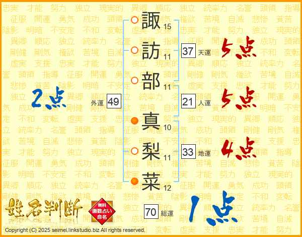 諏(15画)訪(11画)部(11画) 真(10画)梨(11画)菜(12画)