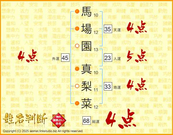 馬(10画)場(12画)園(13画) 真(10画)梨(11画)菜(12画)