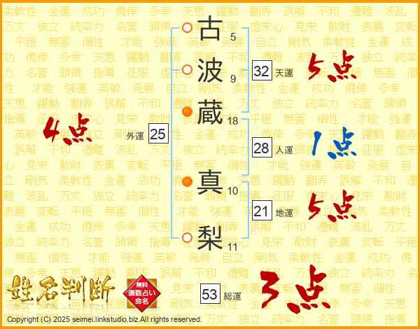 古(5画)波(9画)蔵(18画) 真(10画)梨(11画)
