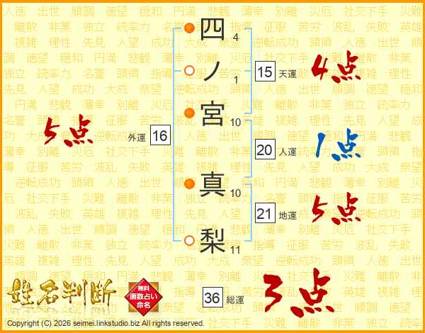 四(4画)ノ(1画)宮(10画) 真(10画)梨(11画)