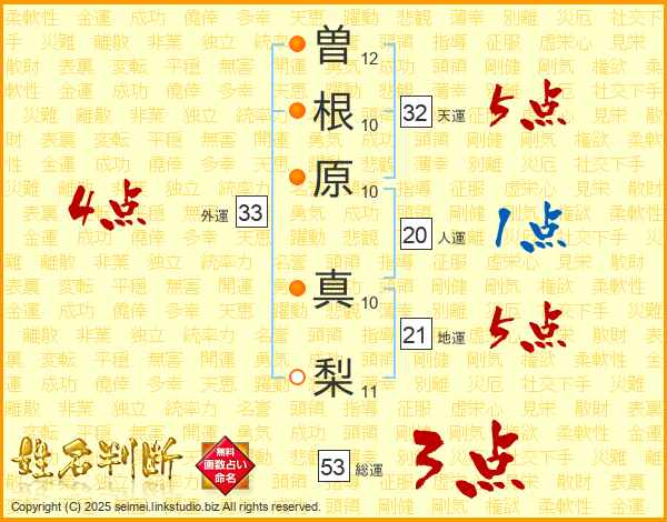 曽(12画)根(10画)原(10画) 真(10画)梨(11画)
