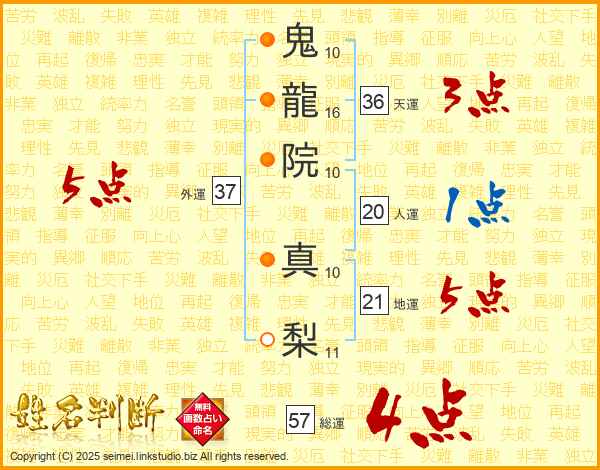 鬼(10画)龍(16画)院(10画) 真(10画)梨(11画)