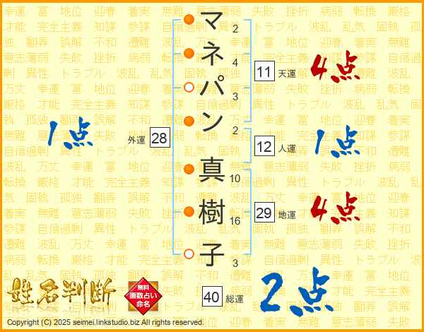 マ(2画)ネ(4画)パ(3画)ン(2画)  真(10画)樹(16画)子(3画)
