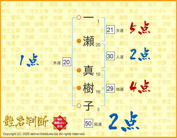 一(1画)瀬(20画) 真(10画)樹(16画)子(3画)