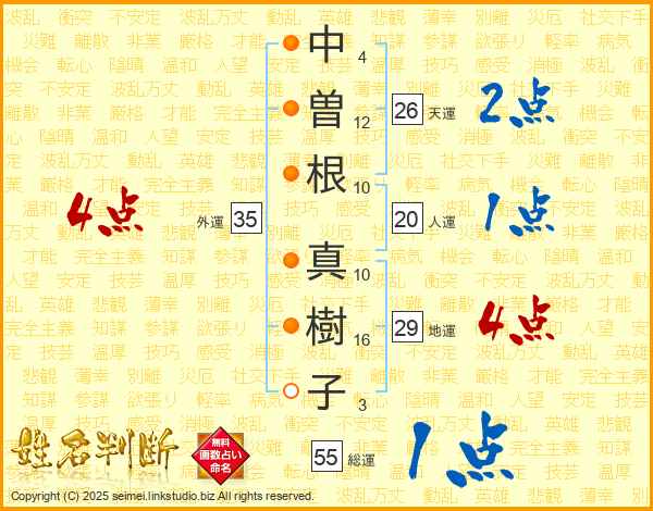 中(4画)曽(12画)根(10画) 真(10画)樹(16画)子(3画)