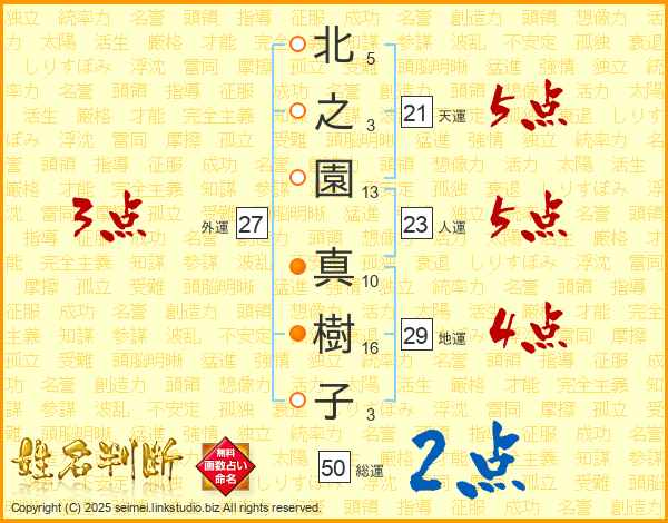 北(5画)之(3画)園(13画) 真(10画)樹(16画)子(3画)