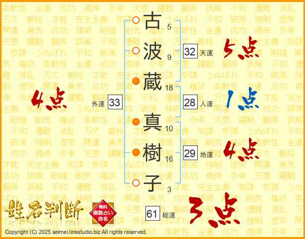 古(5画)波(9画)蔵(18画) 真(10画)樹(16画)子(3画)