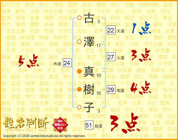 古(5画)澤(17画) 真(10画)樹(16画)子(3画)