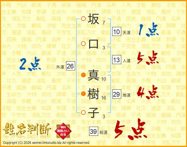 坂口真樹子さんの総運は39画の5点!