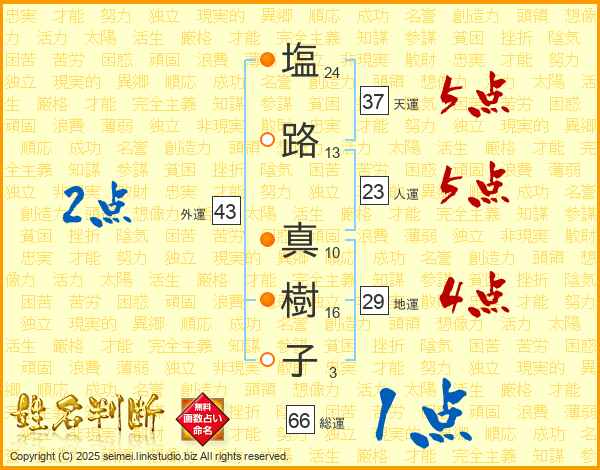 塩(24画)路(13画) 真(10画)樹(16画)子(3画)