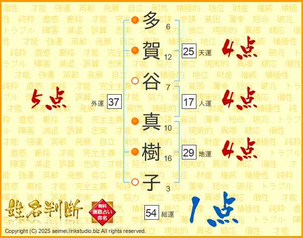 多(6画)賀(12画)谷(7画) 真(10画)樹(16画)子(3画)