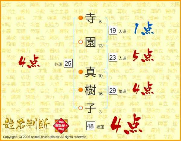 寺(6画)園(13画) 真(10画)樹(16画)子(3画)