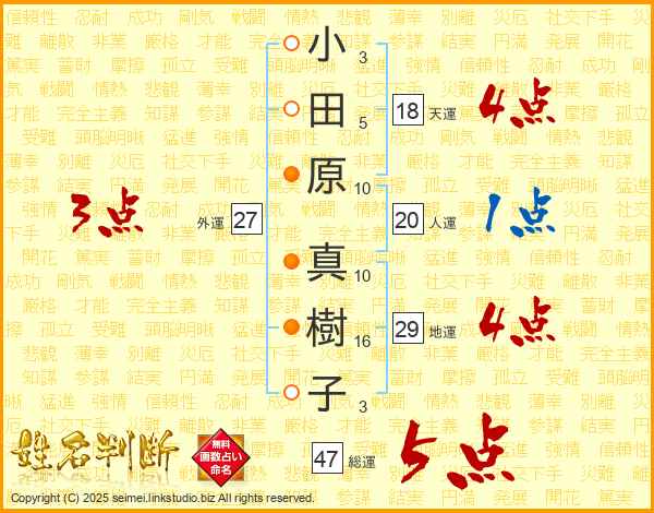 小(3画)田(5画)原(10画)  真(10画)樹(16画)子(3画)