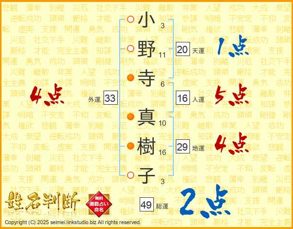 小(3画)野(11画)寺(6画) 真(10画)樹(16画)子(3画)